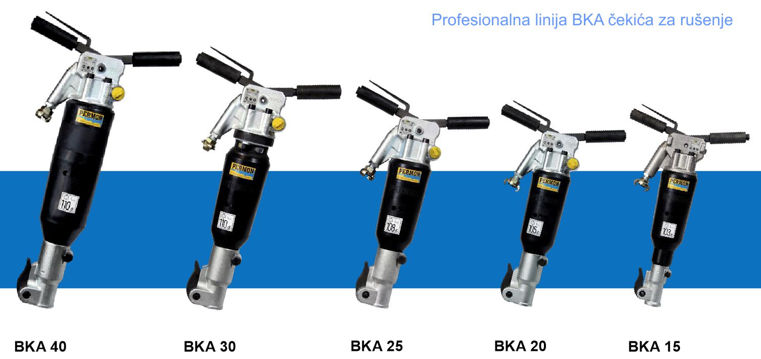 Antivibracijski čekići PERMON BKA za rušenje, dizajnirani su za odvajanje tla i materijala niske i srednje čvrstoće ( npr. beton, bitumenske ceste, ugljen). Uglavnom se koriste u građevinarstvu, rudarstvu i otvorenim operacijama. Izgled i težina prikladni su za rudarstvo odnosno rad na nagibu, tj. vertikalno ili nagnuto prema dolje. Certificirani po ATEX direktivi za upotrebu u metanskim jamama EXI-M2.